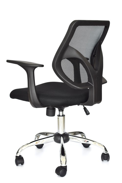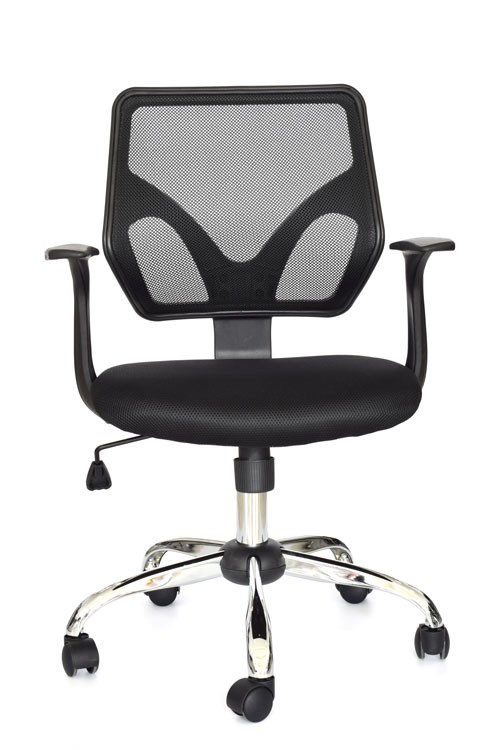 ESPALDAR Espaldar inyectado en polipropileno, tapizado en malla nylon. ASIENTO Asiento tapizado en paño con espuma laminada. MECANISMO Mecanismo basculante con una posicion de bloqueo a 90°. Regulación de tensión mediante perilla. Neumático con elevación a gas. BASE Base cromada de 60 cm Base nylon de 60 cm RODACHINAS Ruedas nylon 50 mm BRAZOS Brazos fijos en polipropileno