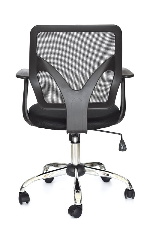 ESPALDAR Espaldar inyectado en polipropileno, tapizado en malla nylon. ASIENTO Asiento tapizado en paño con espuma laminada. MECANISMO Mecanismo basculante con una posicion de bloqueo a 90°. Regulación de tensión mediante perilla. Neumático con elevación a gas. BASE Base cromada de 60 cm Base nylon de 60 cm RODACHINAS Ruedas nylon 50 mm BRAZOS Brazos fijos en polipropileno